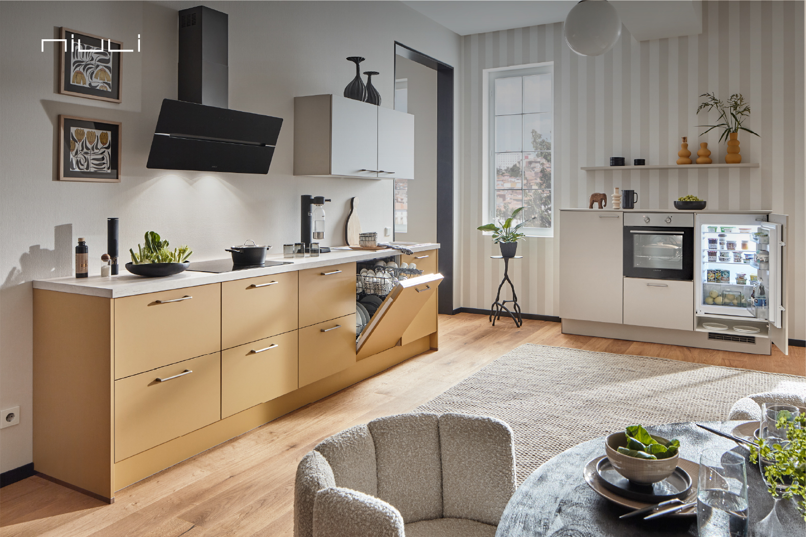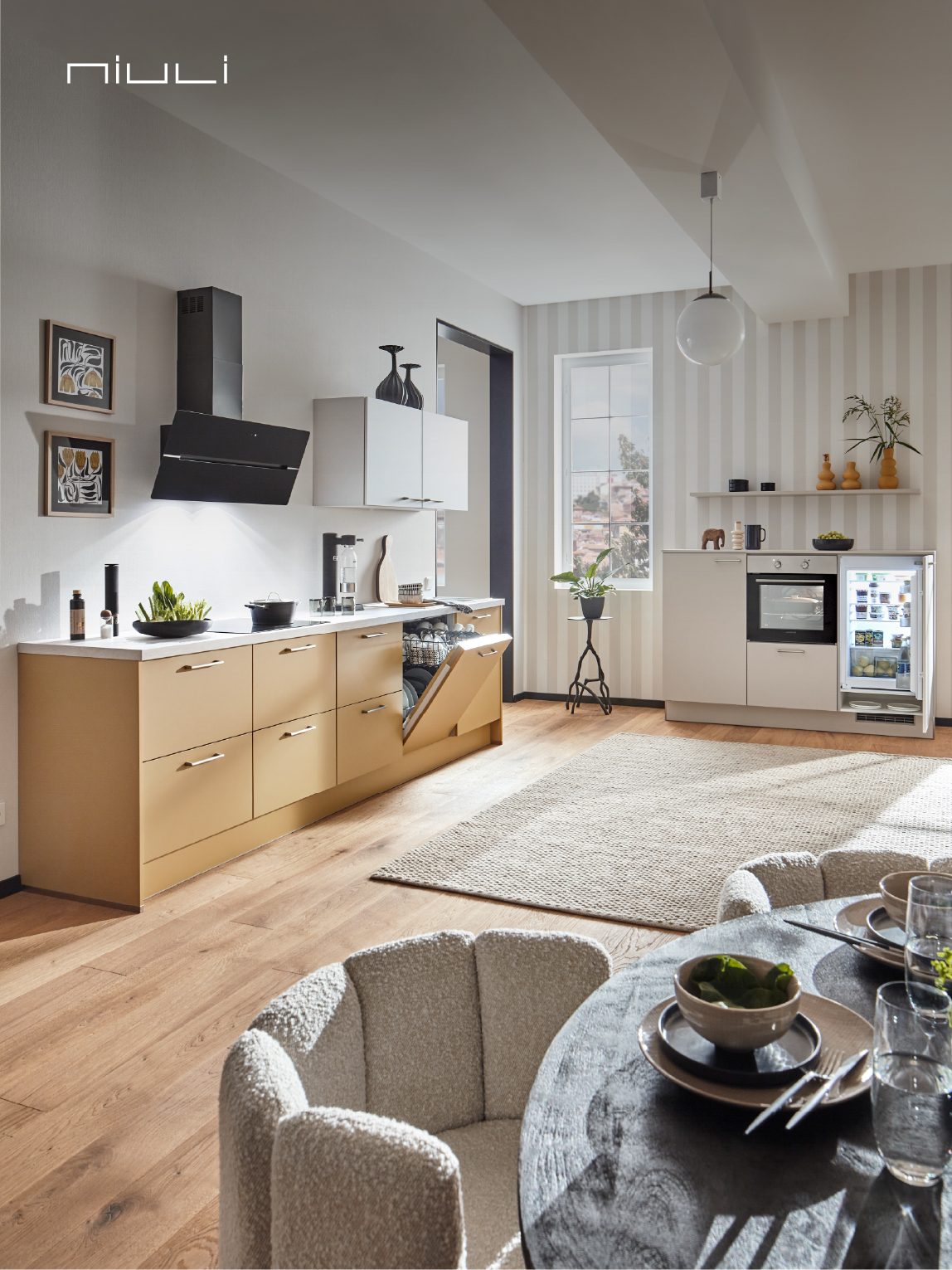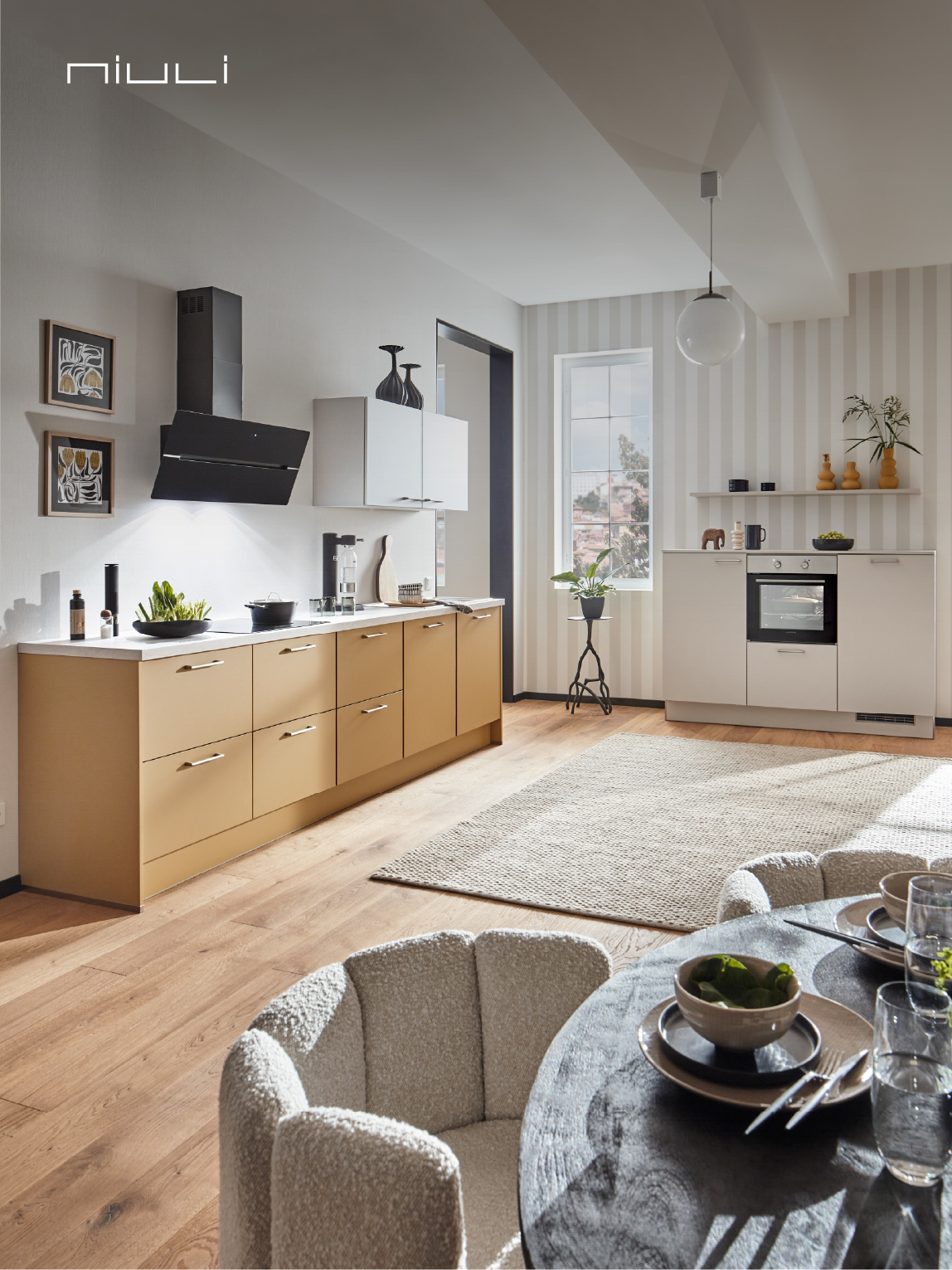 Bright and playful, this kitchen pairs warm caramel color cabinets with crisp white elements for a fresh, modern look. The open design, accented by stylish decor and natural wood flooring, creates a cozy and inviting atmosphere. Perfect for those who appreciate a unique blend of contemporary style and cheerful charm.
