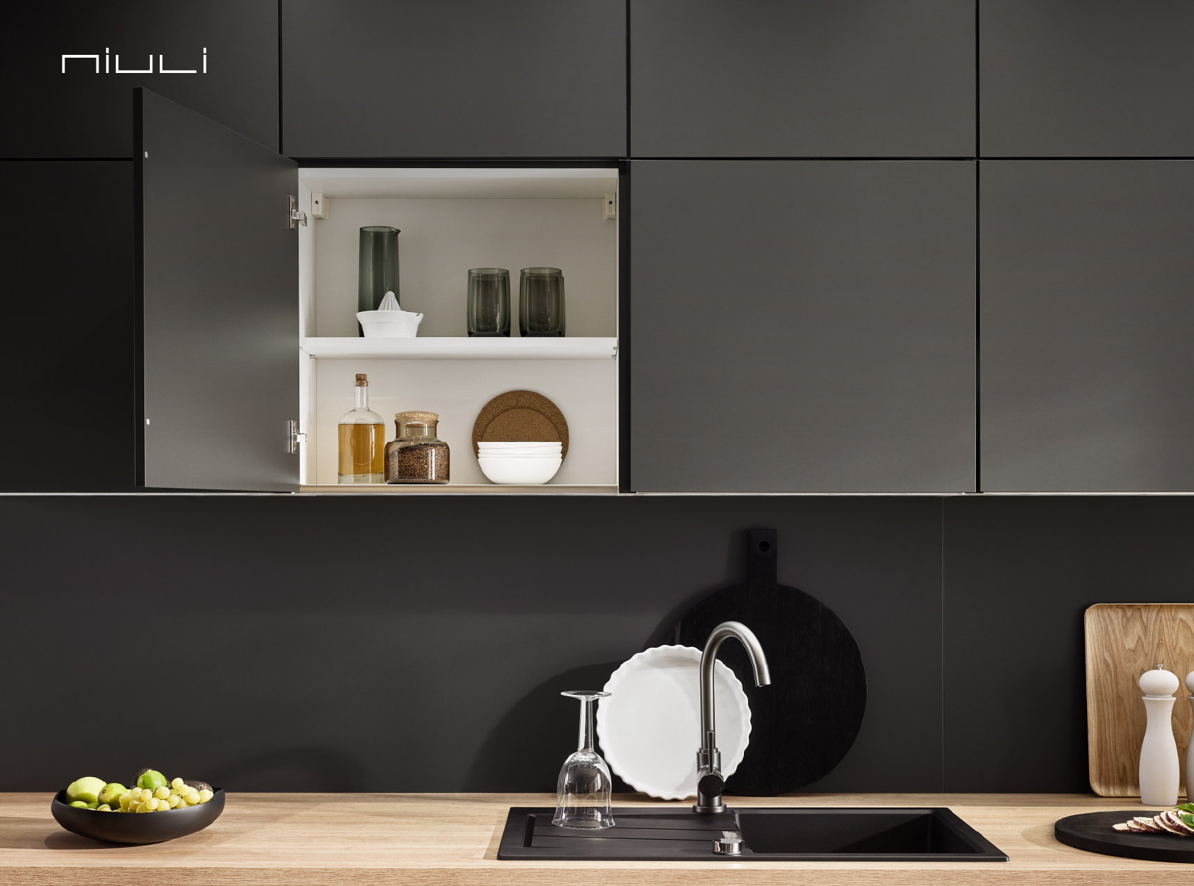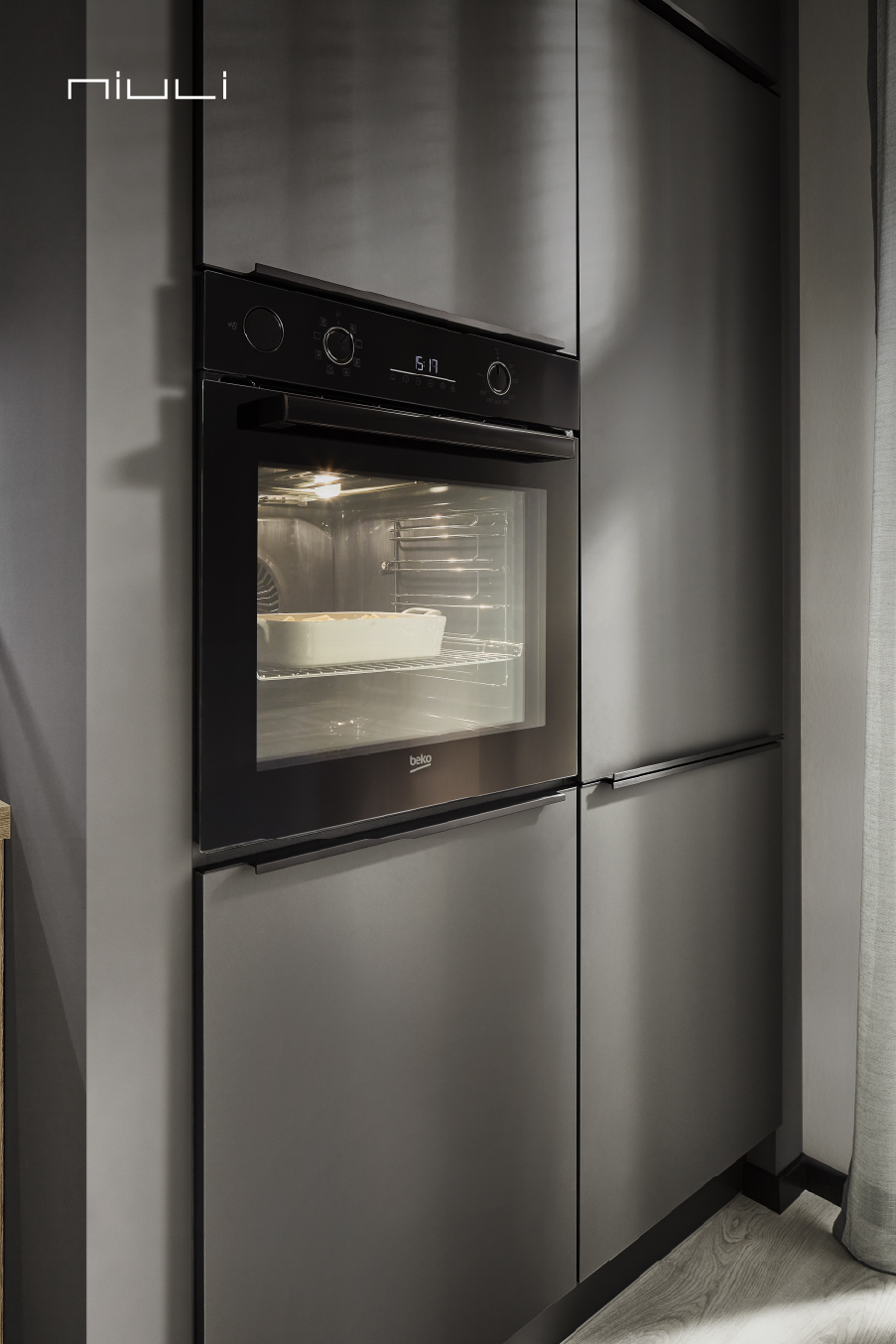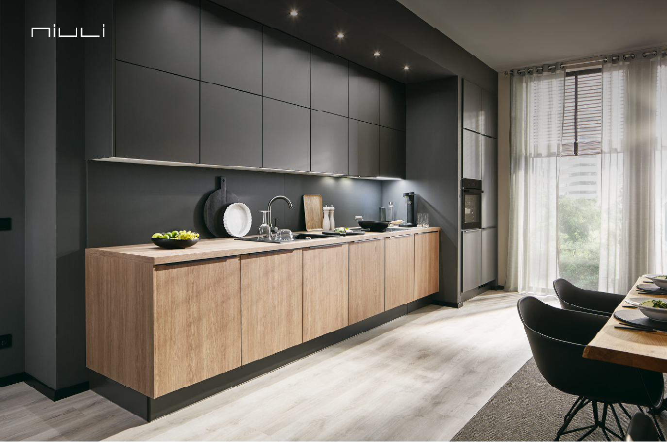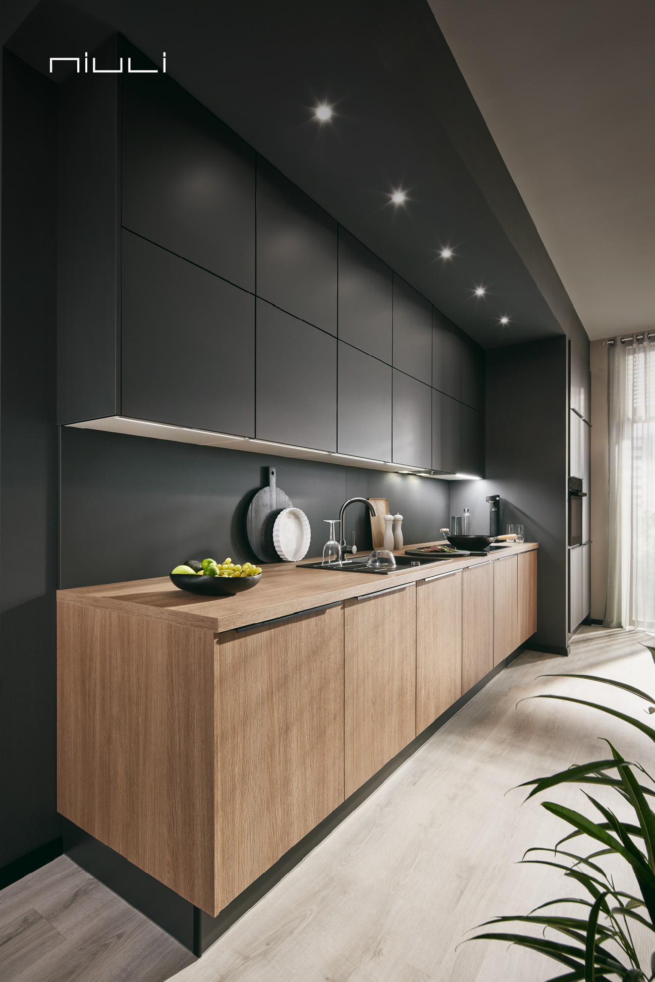 Modern, linear and cleverly designed, this kitchen is the stylish answer to tidiness. With a hint of luxury, it is wonderful for discerning individuals who love having everything in its place. This smart, sophisticated ambiance is perfect for winding down after a long day at work.